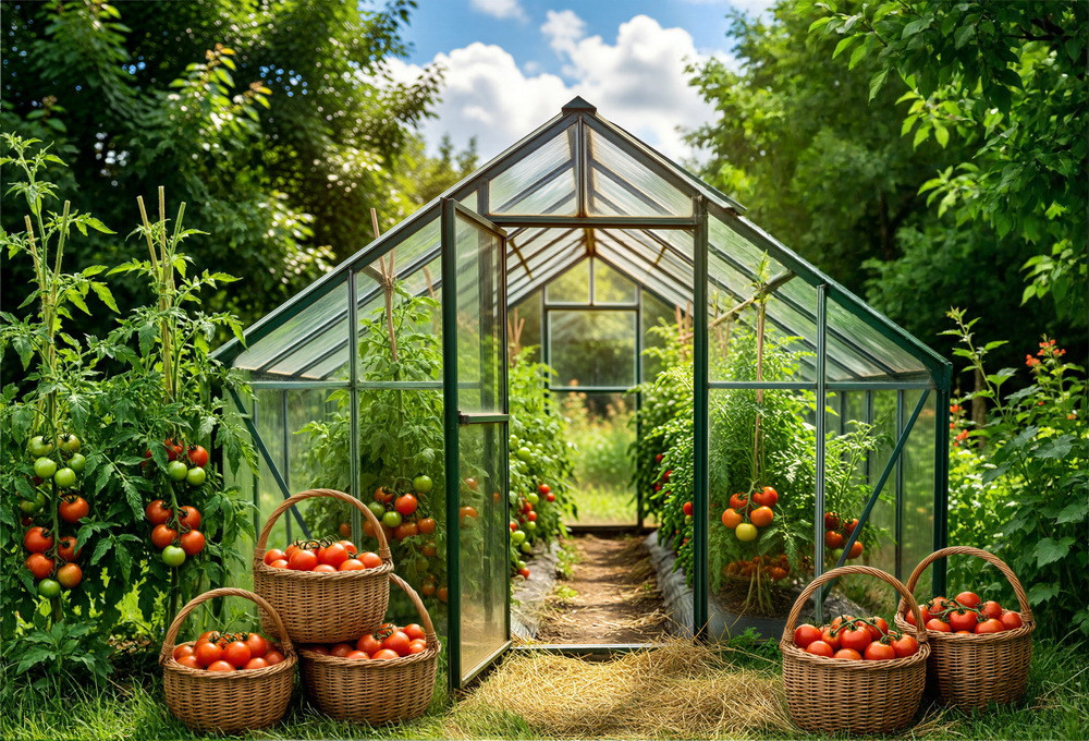 На изображении показана композиция из растений в горшках и плетеных корзинах, расположенных у белой ..