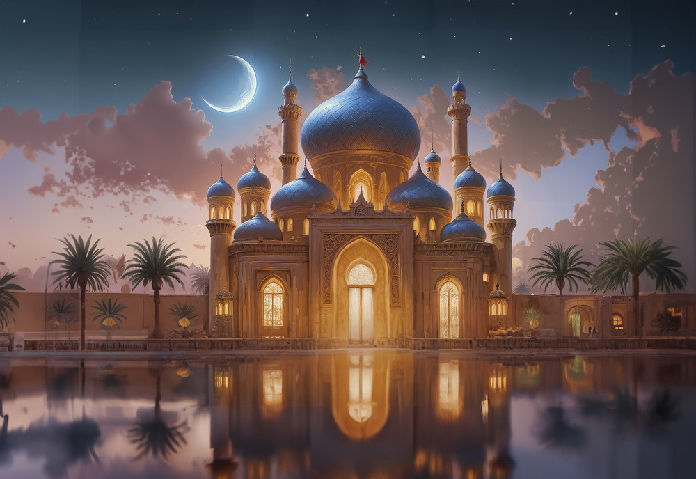 Изображение представляет собой пейзаж с арабским замком в стилистике мультфильма Алладин, расположен..
