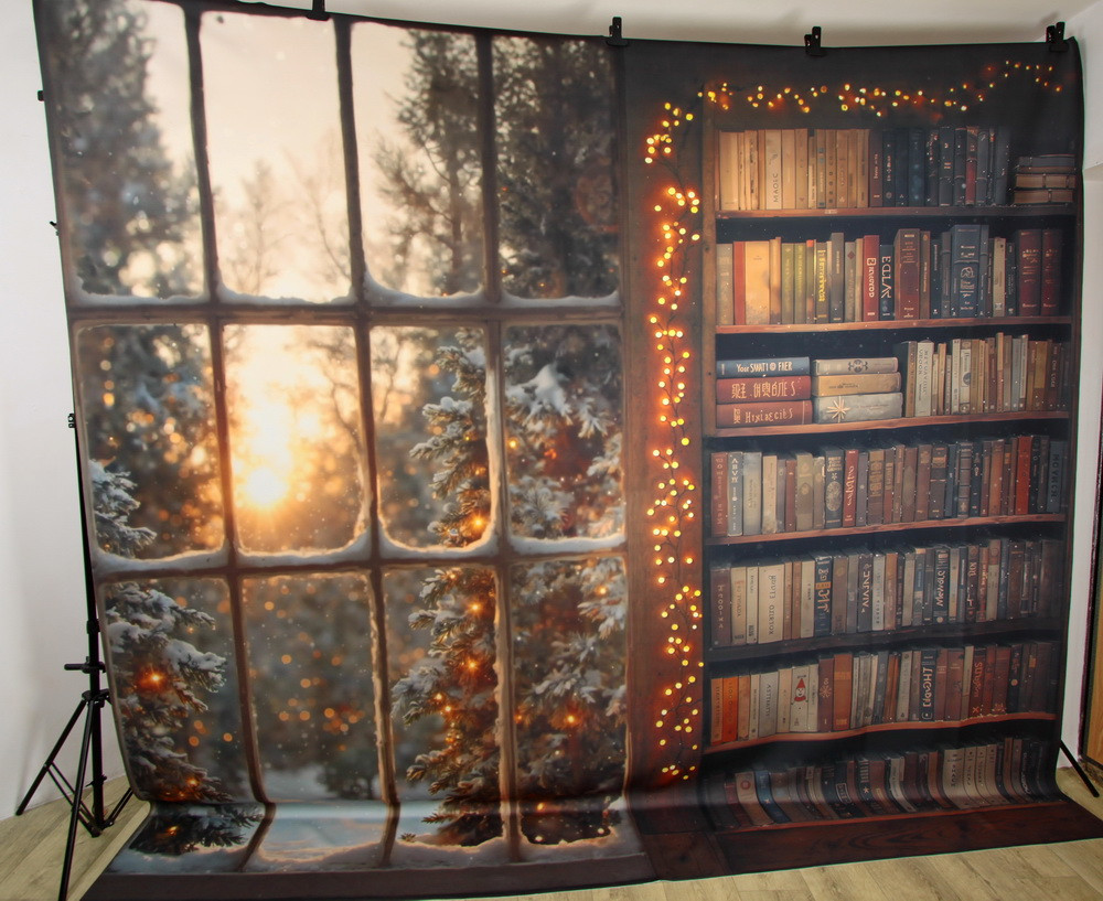 На изображении показан вид из окна зимой и книжный шкаф. Окно состоит из нескольких рам, и на рамах ..