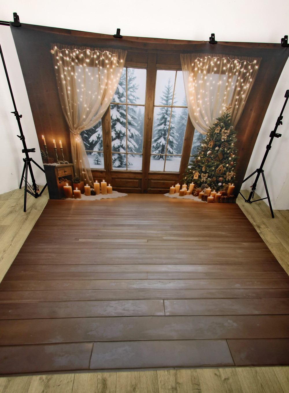 На изображении представлен интерьер комнаты, украшенной к Рождеству, с видом на заснеженный зимний п..