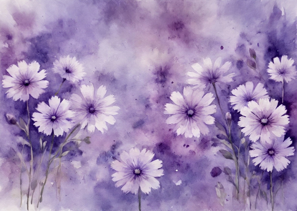 В верхнем левом углу изображены сиреневые ромашки на фоне размытого фиолетового и лилового пейзажа.