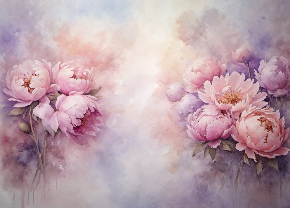 В нижнем правом углу изображены розовые пионы на фоне размытого розового, лилового и белого пейзажа.