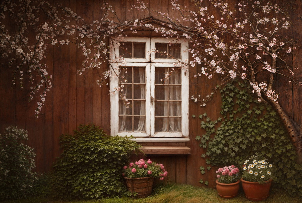 Вокруг окна свисают ветви дерева с мелкими белыми цветами. С правой стороны стены растёт плющ, частично закрывающий деревянную обшивку. Внизу, возле стены, расположен куст с густой зеленью.