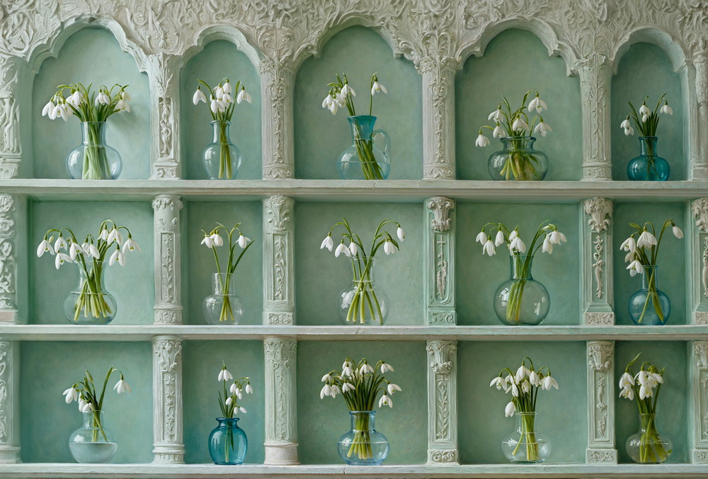 Изображение представляет собой этажерку с тремя полками, разделенными вертикальными колоннами, образующими арки. Задняя стенка и архитектурные элементы этажерки выполнены в приглушенном мятном цвете. Каждая арка на всех трех полках содержит вазу с белыми подснежниками.