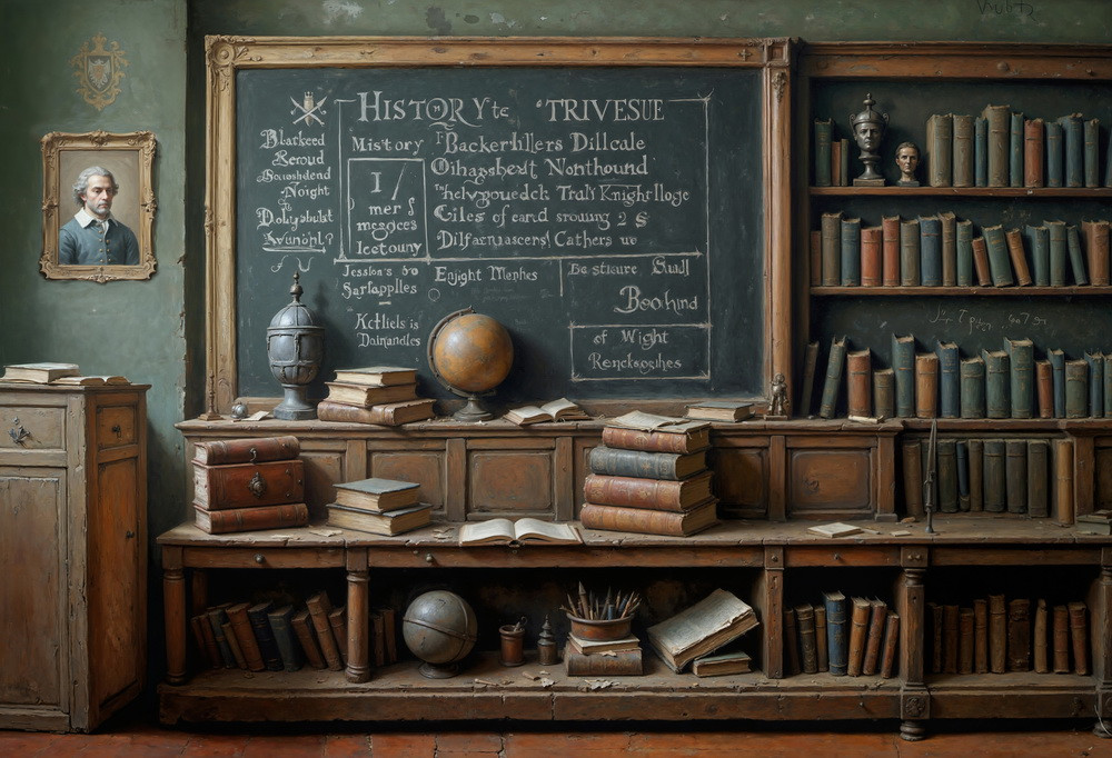 В центре композиции доминирует большая черная доска в деревянной раме, на которой белым мелом написаны слова и фразы. Текст на доске включает в себя "HISTORY te 'TRIVESUE", а также списки слов и фраз. Под доской находится деревянный стол, на котором расставлены стопки книг, глобус, чернильница и другие предметы.