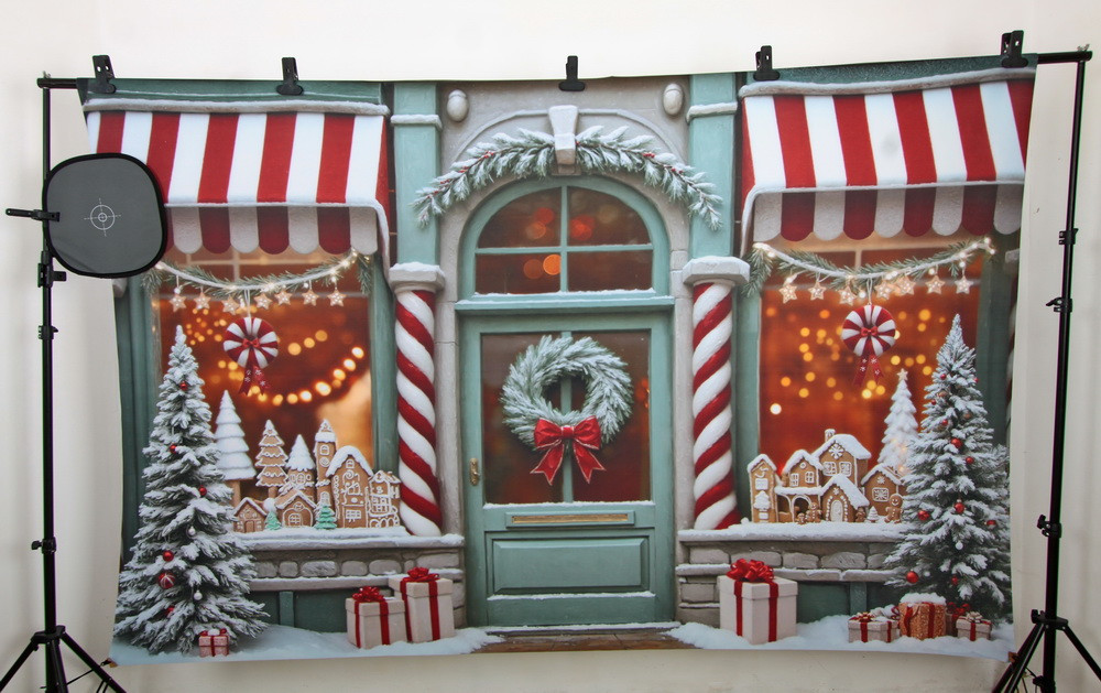 Изображение представляет собой фасад магазина, оформленный в рождественской тематике. Над входом расположены два красных с белым полосатых навеса. Под каждым навесом висит гирлянда с маленькими звездами, украшающая витрину. В витрине располагаются украшенные снегом ёлки разной высоты и пряничные домики.