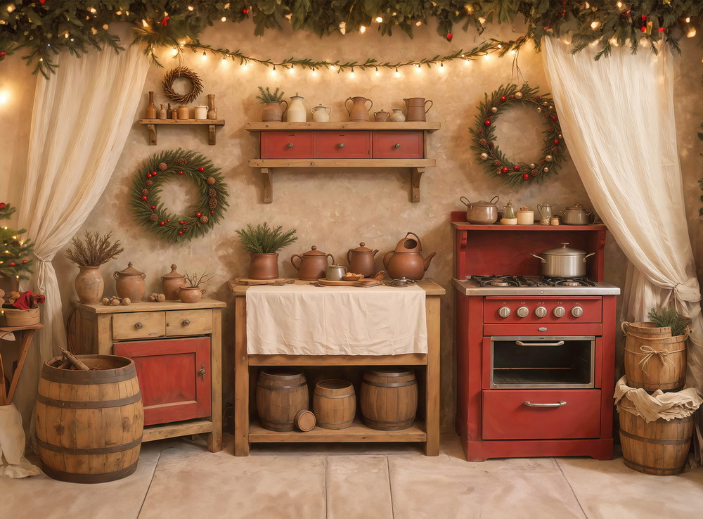 На изображении представлена уютная кухня, оформленная в деревенском стиле с элементами рождественского декора.Стены имеют текстурированную отделку бежевого цвета. Под потолком висит гирлянда из еловых веток с теплыми огоньками. На стене размещены деревянные полки, на которых расставлены различные керамические кувшины, банки и другие предметы декора. Также на стенах висят два рождественских венка, украшенные шишками и красными ягодами. Окна оформлены светлыми, полупрозрачными шторами.В центре композиции находится деревянный стол, накрытый белой скатертью. Под столом стоят небольшие деревянные бочки. Рядом со столом находится комод с двумя выдвижными ящиками и дверцей красного цвета. На комоде расставлены керамические горшки и вазы. Справа от стола стоит красная газовая плита с духовкой. На плите стоит кастрюля из нержавеющей стали. Рядом с плитой также можно увидеть деревянные бочки, наполненные ветками ели.На переднем плане стоит большая деревянная бочка, наполовину заполненная дровами. На полу виден ковер с геометрическим орнаментом. Общая атмосфера изображения создает ощущение тепла, уюта и подготовки к рождественским праздникам.