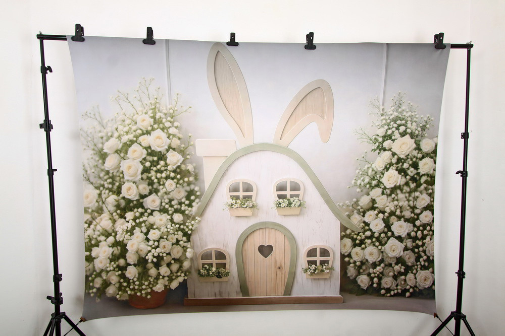 Слева и справа от домика располагаются крупные букеты из белых роз и мелких белых цветочков, создающие пышное обрамление. Фон светлый, однотонный.