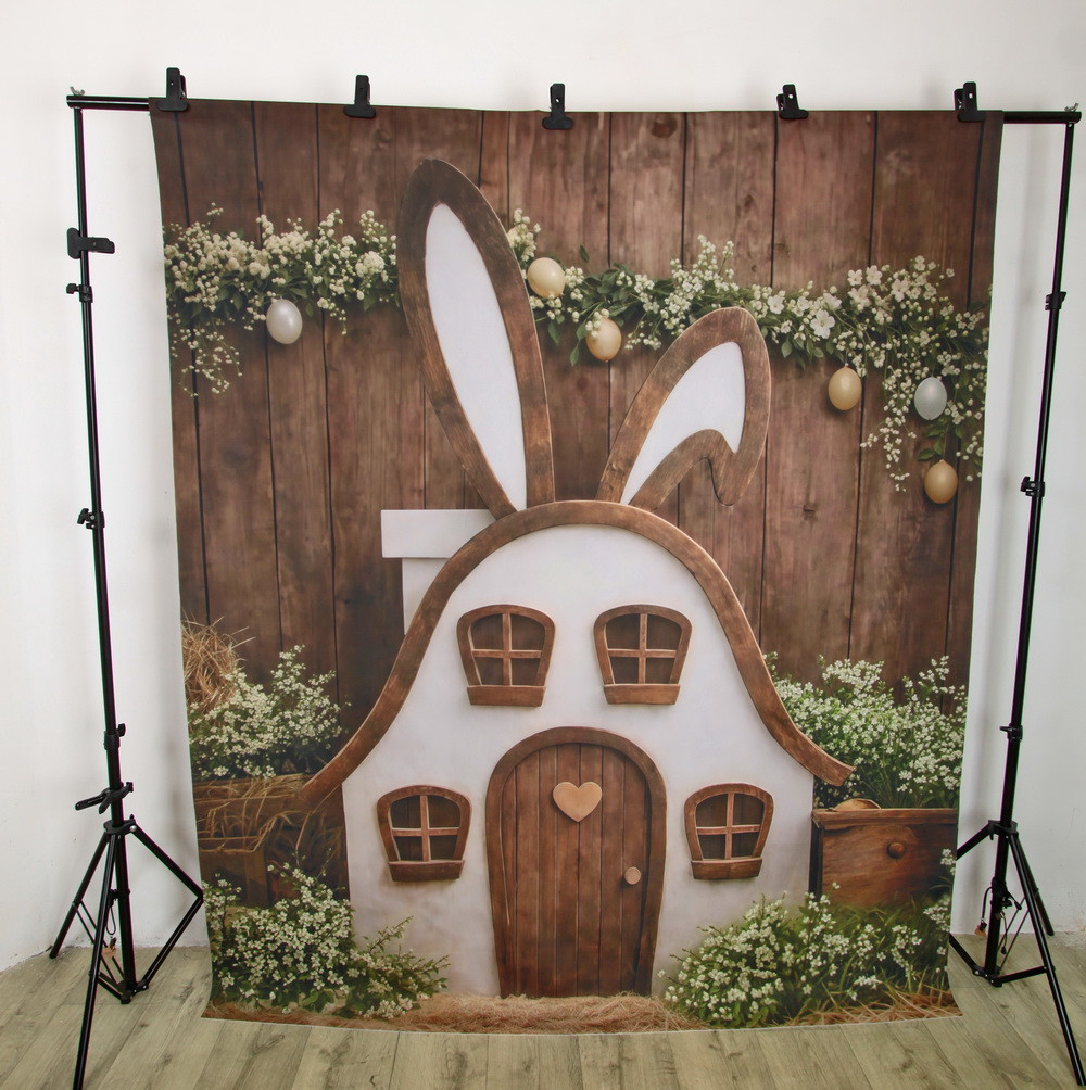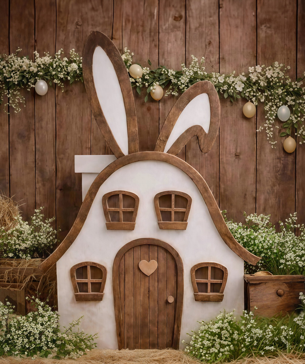 На фотографии изображена декорация в виде домика, стилизованного под пасхального кролика, на фоне деревянной стены. Домик выполнен в белых тонах с коричневой деревянной отделкой. У него изогнутая крыша, четыре маленьких квадратных окна с крестообразными рамами и деревянная дверь в форме арки, украшенная сердечком. Над крышей домика возвышаются два больших кроличьих уха с белыми внутренними сторонами и коричневыми краями.