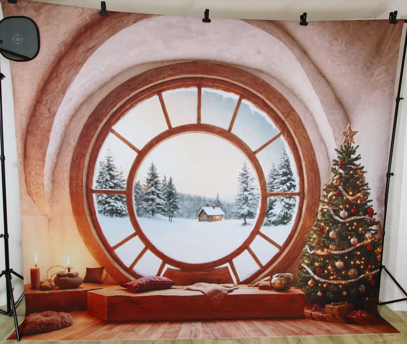 Изображена комната с круглым окном, через которое виден зимний пейзаж. На снегу стоит небольшой деревянный домик, окруженный заснеженными елями. Небо светлое.