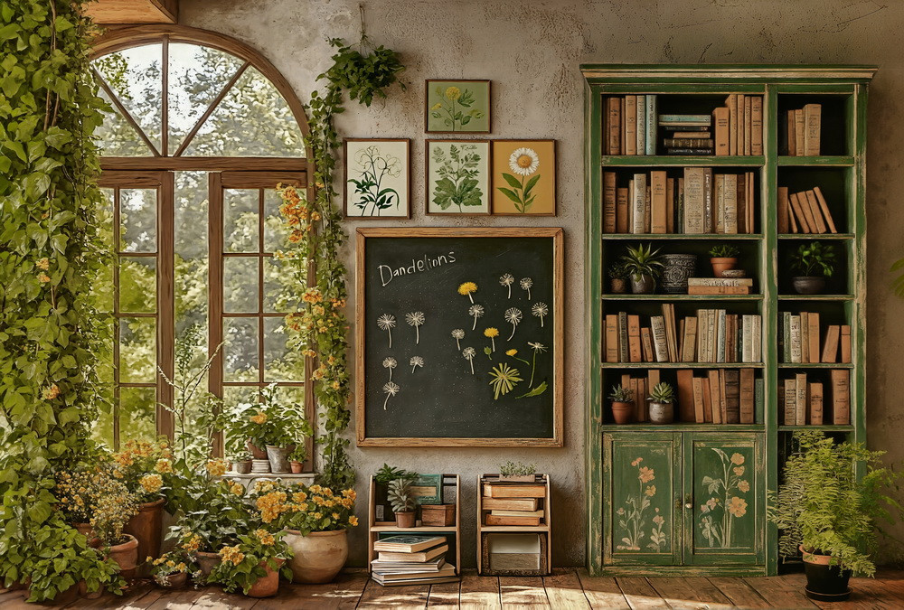 Слева от окна густо разрослись растения, свисающие вниз. Внизу, вдоль основания окна, расставлены горшки с желтыми цветущими растениями. Справа от окна, на стене, висят четыре квадратные картины с ботаническими иллюстрациями. Под ними висит черная доска в деревянной раме, на которой написано "Dandelions" (Одуванчики) и нарисованы одуванчики в разных стадиях роста.