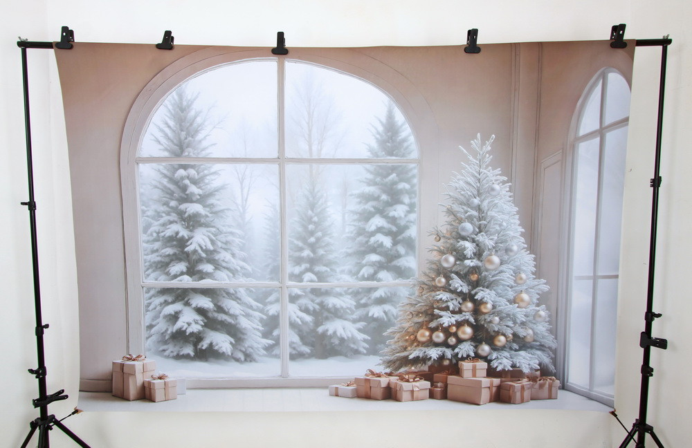 На изображении виден интерьер комнаты с новогодним настроением. В комнате два больших арочных окна. За окнами виден зимний лес, покрытый снегом.