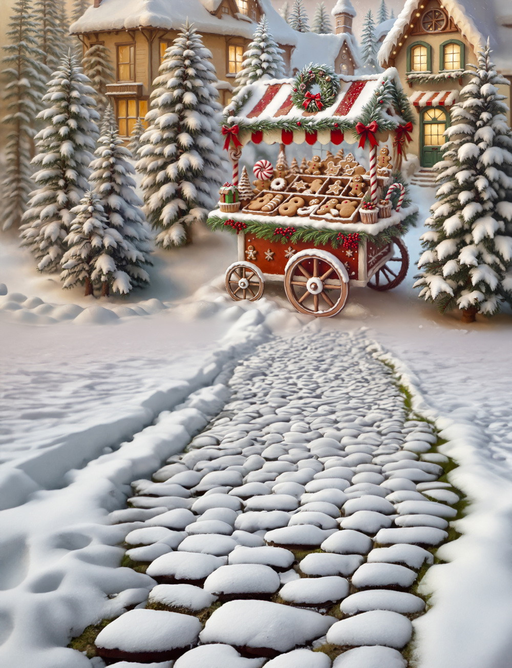 Главный объект — красочный рождественский рынок, представляющий собой передвижной прилавок с красными и белыми полосатыми навесами, украшенным рождественским венком и бантами. Прилавок загружен разнообразным рождественским печеньем, пряниками и конфетами, искушающими зрителя. С обеих сторон от прилавка стоят ели, укрытые снегом. На заднем плане расположены несколько симпатичных домов, украшенных для праздников. Дорожка, устланная камнями, расположена в переднем плане, покрыта снегом и ведет к рынку.