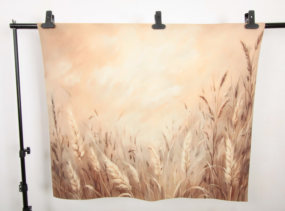 Изображение представляет собой стилизованную картину, изображающую поле пшеницы. Цветовая палитра ограничена различными оттенками бежевого, коричневого и кремового.