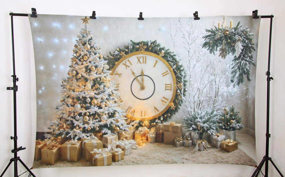 На заднем плане установлен большой круглый циферблат часов с римскими цифрами, окруженный зеленым рождественским венком, украшенным золотыми цветами и светящимися огнями. Часы показывают около половины одиннадцатого.