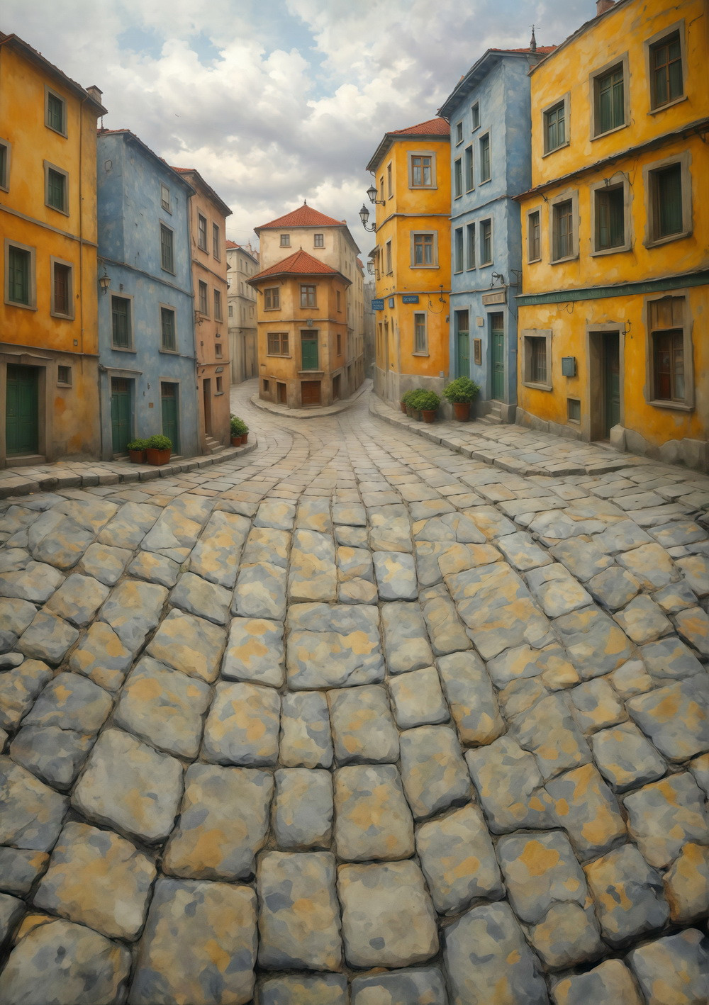 Дорога выложена из камней серого цвета с оттенками желтого. Она изгибается, создавая перспективу, уходящую вдаль между зданиями.