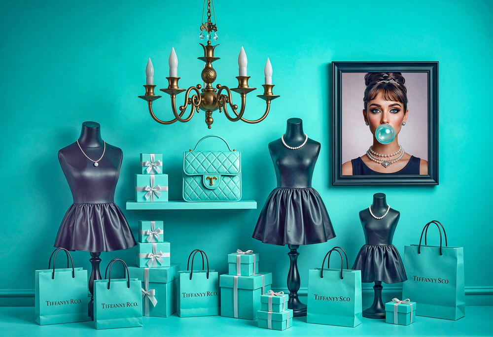 Интерьер комнаты оформлен в бирюзовом цвете. В комнате присутствует люстра золотистого цвета с тремя рожками, на каждом из которых установлены белые свечи. Под люстрой на полке расположены бирюзовая сумочка с золотистой застежкой и две бирюзовые коробки, перевязанные серебристыми лентами. На переднем плане стоят три манекена с платьями темного цвета. На каждом манекене надето жемчужное ожерелье. Перед манекенами стоят бирюзовые подарочные пакеты с надписью "TIFFANY & CO", а также бирюзовые коробки, перевязанные серебристыми лентами.