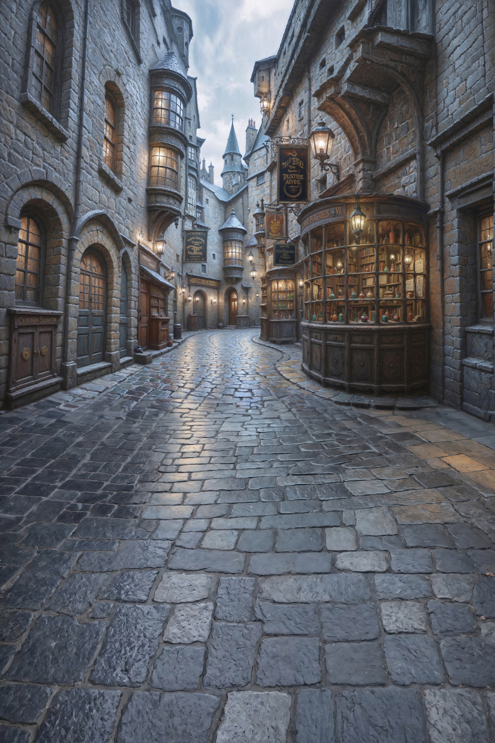 По обеим сторонам улицы стоят высокие здания из серого камня. Архитектура зданий сложная, с арочными окнами, эркерами и декоративными элементами. В окнах горит теплый свет, создавая уютную атмосферу.