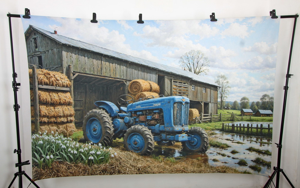 На переднем плане стоит старый синий трактор, частично стоящий в луже. На тракторе надпись "FORD" и "FORDSON SUPER". Рядом с трактором растут подснежники.