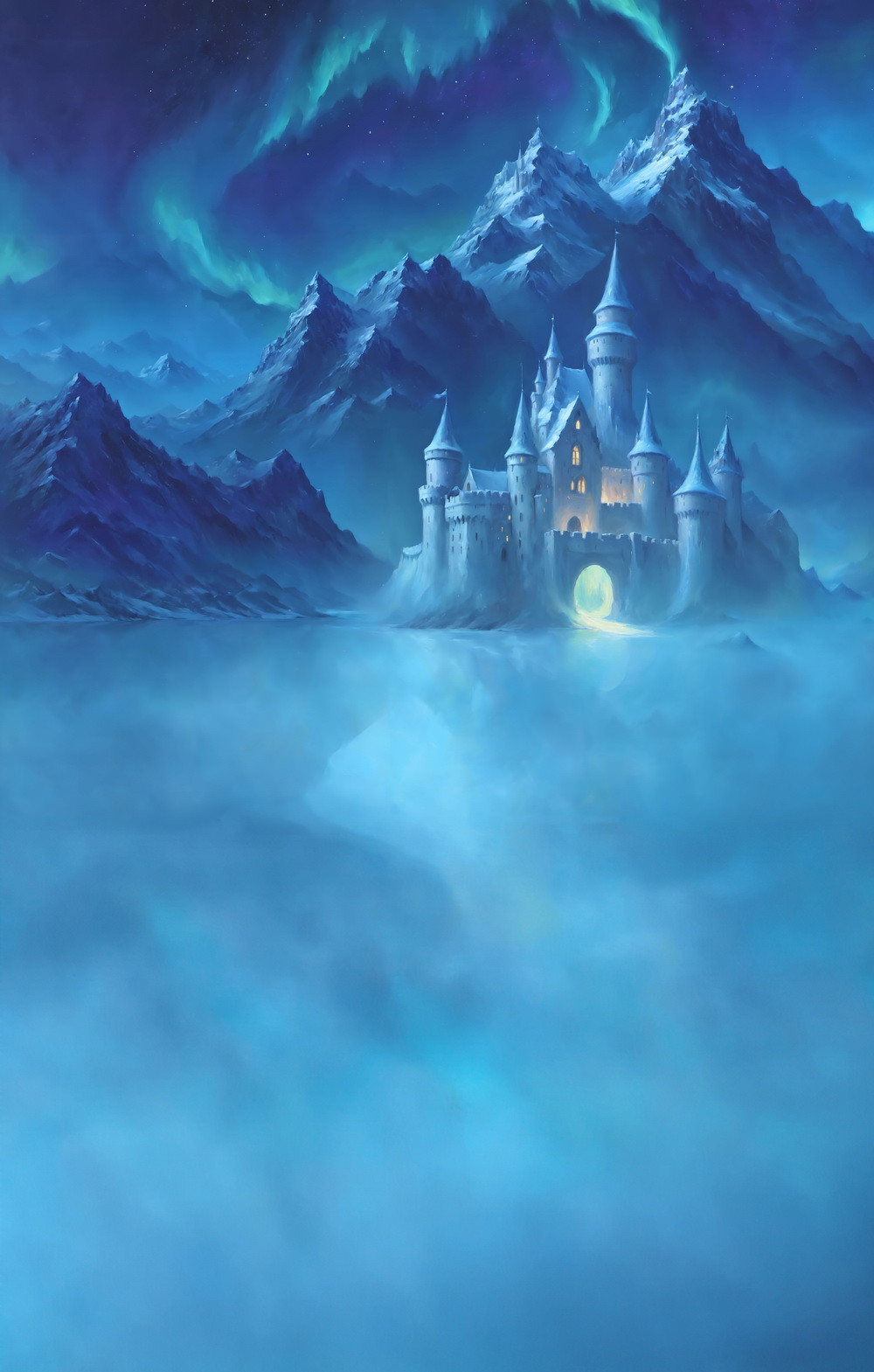 Изображение представляет собой цифровое художественное произведение, изображающее замок в окружении гор и под полярным сиянием.